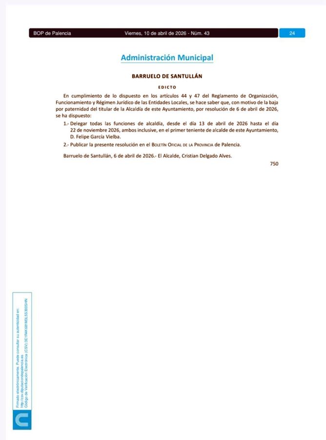 El Bolet铆n Oficial de la Provincia de Palencia da cuenta de la delegaci贸n de todas las funciones de la alcald铆a, desde el pasado d铆a 13, y hasta el pr贸ximo mes de noviembre en Felipe Garcia Vielba.